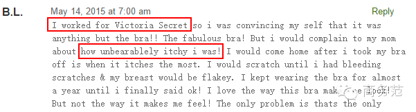 对于维秘内衣的质量,不少人表示很失望,因为维密有些内衣会令皮肤瘙痒,出疹。有位在维秘工作的女生表示:“内衣很好看,可是真的造成皮肤太痒了,有时候甚至会养到抓流血。”笔者找来截图给大家看看: