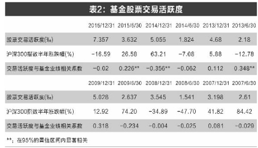 统计结果显示,市场行情对基金交易的活跃度并没有显著影响。交易活跃度超过5%。的三个时段分别为2015年下半年的熊市,2014年下半年的牛市和2009年下半年的震荡行情。而在2007年全年,2009年上半年和2015年上半年的大牛市行情中,基金的交易活跃度相对而言却并不高。