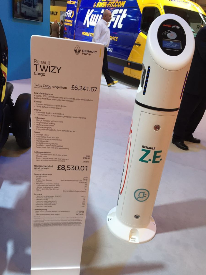 雷诺发布的这款小型纯电动车吸引了很多人驻足观看。这款名为Twizy的小车是雷诺在2012年时推出的双座四轮电动车,前后各一的座位配置,车身尺寸为2337×1191×1461mm,和smart大小差不多,马达可输出17hp/5.8kgm最大动力,续航力最长100km,对于多数大城市的通勤族来说应该够用!