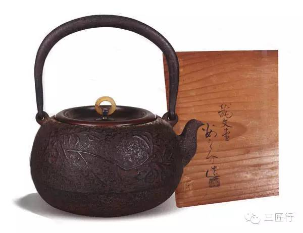 叶纹铁瓶,明治初期龙文堂名人安之介作。在日本的铁壶堂号中,“龙文堂”被誉为日本第一堂号