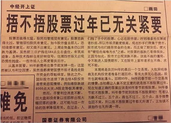 到了1994年,CPI快速上升,国债期货交易也更加活跃,多空搏杀空前激烈,以至于最后酿成327事件。而股市的大量资金被国债期货和商品期货吸走,如深交所日交易量最低的时候,大约只有几个亿金额。记得1995年快要过春节的时候,有客户问我,究竟是要持币过节还是持股过节,我当时觉得这个问题问得好奇怪,因为大客户们都在做国债期货,谁还在乎股市如何呢。正好那时《中国证券报》每周有一个栏目叫“十大券商看市场”,我便以《捂不捂股票过年已无关紧要》为题,写了一个周评。