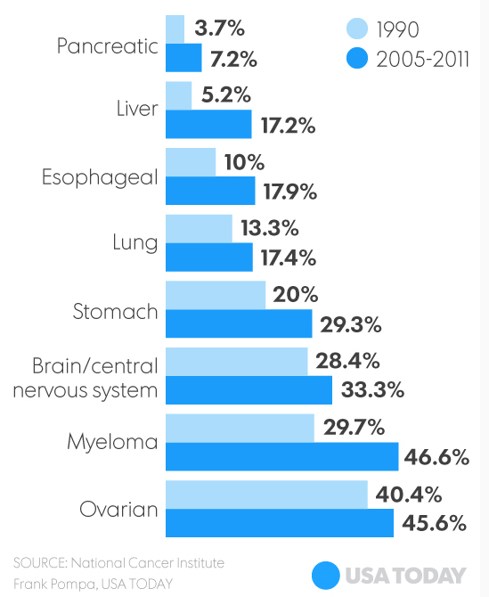 来自Parker的The Immunotherapy Dream Team针对各种癌症的免疫治疗后五年存活率的数据统计