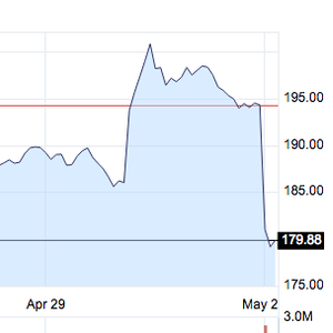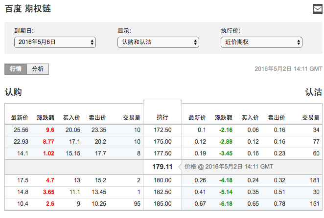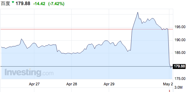 北京时间5月2日美股开盘,百度便暴跌近8%。截至同日10:38分记者发稿前,百度报178.96美元,跌幅达7.90%。