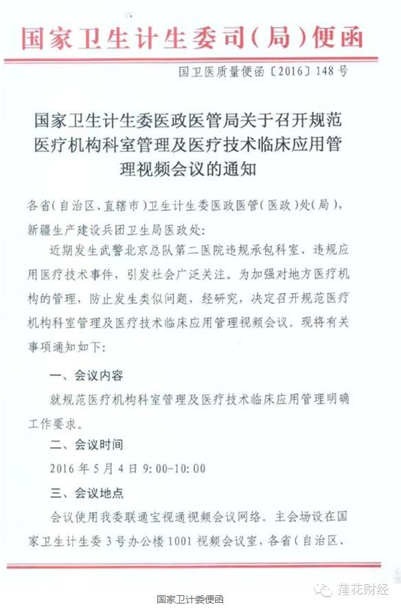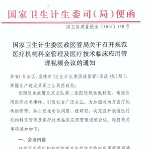 据悉,5月4日上午国家卫计委医政医管局就规范医疗机构科室管理及医疗技术临床应用管理召开视频会议,并对相关要求进行了明确。