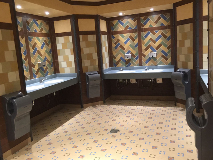每隔一段距离都有洗手间,门口还有直饮水,洗手间也是精心设计过,不同区域的洗手间风格迥异,连洗手间都是一道风景!