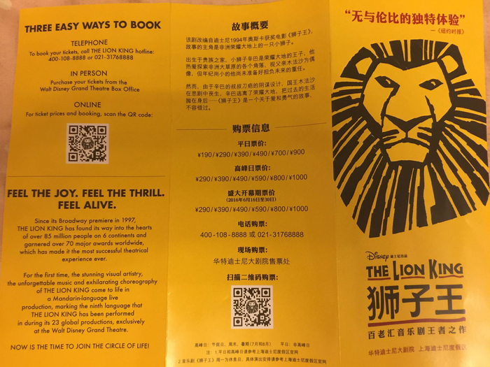 最后奉上的是上海迪士尼乐园的官方地图和迪士尼小镇上的《狮子王》演出信息,可以作为福利收藏哦!