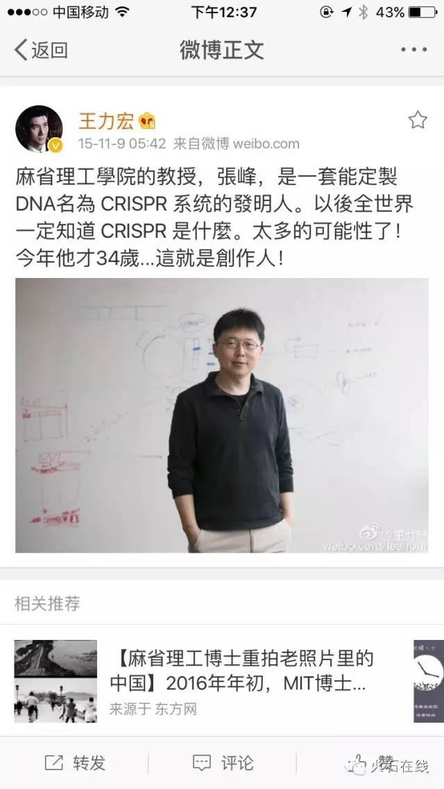 就连娱乐圈的偶像王力宏也发微博力挺基因编辑的热门技术——CRISPR/Cas9,似乎为基因编辑做了免费“代言”。
