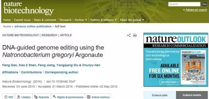 近日,由河北科技大学韩春雨副教授作为通讯作者的研究论文《DNA-guided genome editing using the Natronobacterium gregoryi Argonaute》(以下简称NgAgo-gDNA)在国际顶级期刊《自然生物技术》(Nature Biotechnoligy)杂志上发表。引起了国内外生物学界的广泛关注,而基因编辑更被《麻省理工科技评论》评选为“2016年十大突破技术”之一。