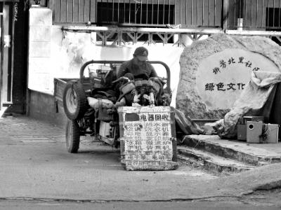 上午九点,老章的摊也已开张了近一个小时,整个地盘被他拿三块大铝牌围了起来,铝牌上“香河园再生资源回收亭”的字已被磨得很难辨认。