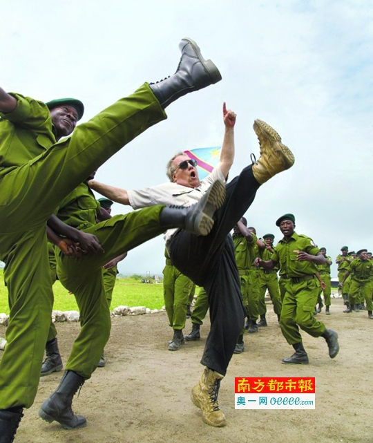 ←霍华德·巴菲特2013年访问刚果民主共和国时和刚招募的护林员一起跳舞。