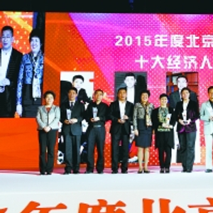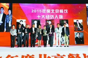 世界中餐业联合会会长杨柳(左五)、中国烹饪协会会长姜俊贤(右一)、中国饭店协会会长韩明(左一)为获得2015年度北京餐饮十大经济人物的企业家代表颁奖。获奖者从左至右依次为中国全聚德(集团)股份有限公司北京全聚德奥运村店总经理郭顺利,北京华天饮食集团常务副总经理贾飞跃,北京东来顺集团有限责任公司董事长周延龙,旺顺阁(北京)投资管理有限公司总裁张雅青,北京西部马华餐饮有限公司总裁马华,北京雅玛餐饮管理有限公司董事长魏青。
