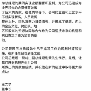 此外,上述知情人士还透露称,鲍毅平素颇为文艺。在此前某论坛的发言中,鲍毅也曾透露自己年少梦想是演员,体验不同的角色和故事。其更称,投行工作能够接触不同、特色各异的行业和人,有充分体验各种具有挑战和乐趣的人生,这是投行工作的魅力所在。在鲍毅发送给同事的邮件中,其也以诗句成文表达离别之意。