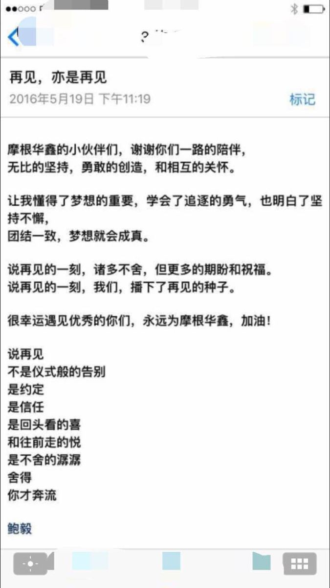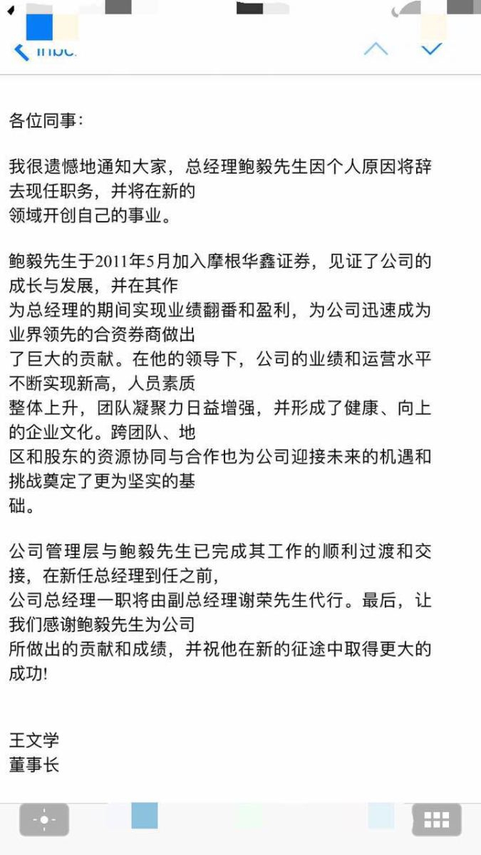 “就是这几天的事情。”上述知情人士表示,邮件所述内容属实,鲍毅目前已提出离职。该人士还表示,鲍毅在摩根华鑫证券资历深厚,未来创业方向依然是相关从业领域。