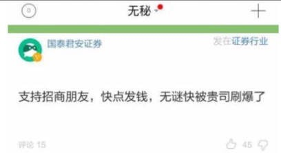 有国泰君安的券商同行深受无秘朋友圈刷屏之扰,无奈之下也呼吁:招商发钱!