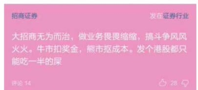 因为这两天,壹资本君(cbnyiziben)先是看到方正证券打响“裁员控成本”的第一枪,后来又看到爆料,招商证券、中银国际等券商的员工在“无秘”(可以简单理解为看不到发帖者的朋友圈)上发帖作诗、排队讨薪。(下附经典诗词摘抄)