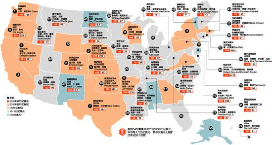 美国54位州首富(有4个州各有两名富豪并列为首富)的总资产达到6820亿美元,平均每人126亿美元,其中只有8人身家没有达到十位数。