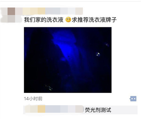 视频中,沾满荧光剂的双手触目惊心,而说词更是让人心惊肉跳。于是,小编身边的小伙伴们也纷纷拿紫光灯进行了自家洗衣液是否含有荧光剂的实验。结果如下图,小伙伴很是紧张,在朋友圈询问哪些品牌的洗衣液更靠谱?