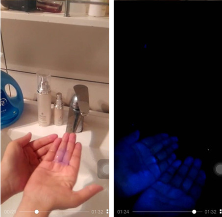 最近,微信里流传这样一则小视频:有人用紫光灯检测出,蓝月亮手洗专用洗衣液含有荧光剂,使用后很难清洗掉留在手上的荧光剂,称“清洗一百次以上才能清洗干净”,甚至还说这些荧光剂“68秒钟进入体内、进入血液”、“7年不走”。