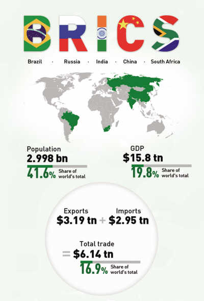 金砖五国人口总数占世界41%,GDP总量占世界19%,贸易总额占16.9%。