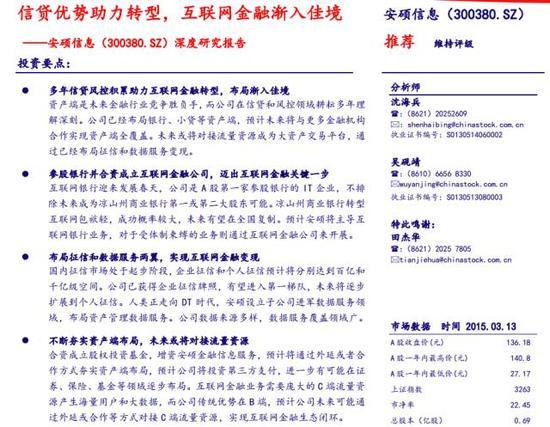 一个月后,沈海兵有接着发布《信贷优势助力转型,互联网金融渐入佳境》报告,明确指出,安硕信息是 A 股首家也是当前唯一一家入股商业银行的的 IT 企业,双方优势结合,未来将开展互联网银行等业务。并预计公司 15-17 年EPS 分别为 0.63、0.78 和 0.99 元,维持“推荐”评级。