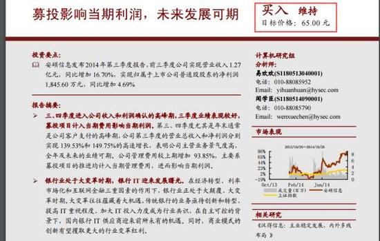 随后,宏源证券易欢欢在2014年10月连续发了两篇安硕信息的研究报告,在报告中明确提示“买入”,且目标价格从《一横一纵稳增长,进军征信保未来》报告中的57元,上调至《募投影响当期利润,未来发展可期》报告中65元,而当时安硕信息股价在60元上下浮动。