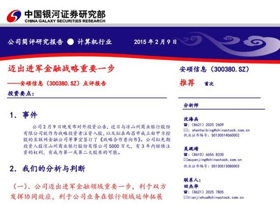 当然,这一切只是开始。互联网金融的故事开篇,要从银河证券沈海兵2015年2月10日所撰写的,《迈出进军金融战略重要一步》研究报告说起。沈海兵在报告中称, 2015 年是互联网金融加速爆发的一年,IT 企业与传统金融企业融合发展并整合金融产业链,将成为未来新常态。前期大智慧收购湘财证券,国内首家互联网券商诞生;本次安硕信息跨界投资入股银行,未来有望进军互联网银行等领域,将有助于公司业务拓展和商业模式升级。首次覆盖,给予“推荐”评级。