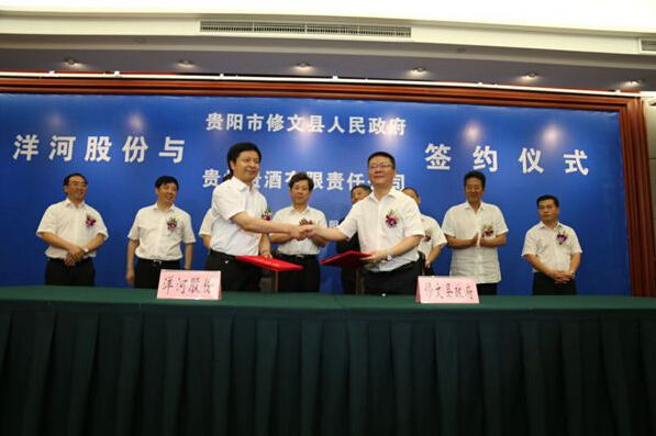 18日上午10时18分,洋河股份贵酒战略并购项目在贵阳市贵州饭店正式签约,贵阳与宿迁两地市领导、苏酒集团总裁、洋河股份董事长王耀等出席签约仪式。王耀在致辞中表示,“贵酒的成功并购,一方面能够推进洋河战略更进一步;另一方面,也将更好地促进贵酒的发展和腾飞。”