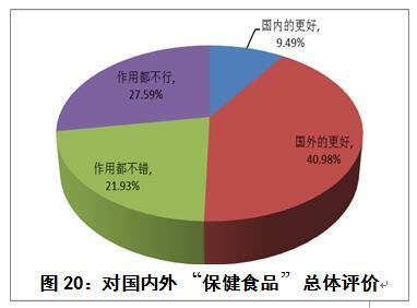 由于消费者对保健食品准确辨识度和认知度偏低,往往将非法宣称功效的普通食品、非法生产经营的假冒保健食品与保健食品混淆,故本次调查结果提示消费者对广义上的所谓“保健食品”(含保健食品、非法宣称功效的普通食品、非法生产经营的假冒保健食品等)市场的总体满意度情况。调查结果表明,约七成消费者对国内保健食品市场总体评价“不太满意”,满意度只有三成(图19)。对国内外保健食品的评价,40.98%消费者更偏爱国外保健食品,只有9.49%消费者认为“国内的更好”。部分消费者对国内外保健食品质量都缺乏足够信心,27.59%的消费者认为“作用都不行”。相比之下,国内保健食品认可度相对偏低。(图20)