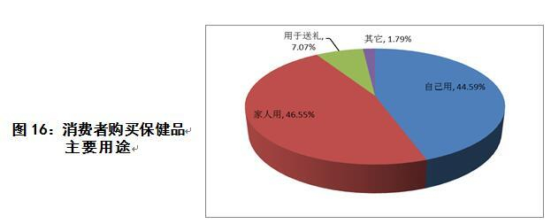 根据调查结果,7195名消费者购买保健食品时,考虑因素最关注“功能”和“安全性”,分别占78.08%和73.50%;其次“价格”、“品牌”和“口碑”也是重要考虑因素(图15)。91.14%购买者,为家人购买和自己使用,少数用于送礼和其它(图16)。