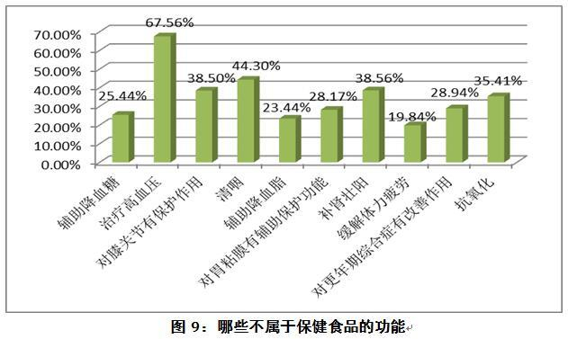 保健食品的主要作用是调节机体功能,不能预防和治疗疾病是大部分消费者的普遍共识(图7),但对保健食品具体的功能认知却较为模糊甚至混乱。目前,国家食药总局受理审批的保健食品功能范围包括27种保健功能。调查结果显示,对是否属于保健食品的5种功能声称选项中,辅助降血压是属于保健功能的唯一选项,只有35.48%的消费者选择正确(图8);10种是否不属于保健食品的功能声称选项中,“治疗高血压”、“对膝关节有保护作用”、“补肾壮阳”、“对更年期综合症有改善作用”不属于保健食品功能,但大部分消费者都作出了错误的选择(图9)。