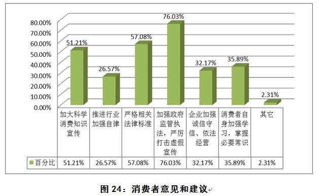 6.消费者希望主管部门在打击虚假宣传、加强执法力度,完善法律法规及技术标准等方面进一步有所作为,同时希望相关部门加强保健食品科学消费知识的宣传与普及,积极回应广大消费者疑惑与关切。