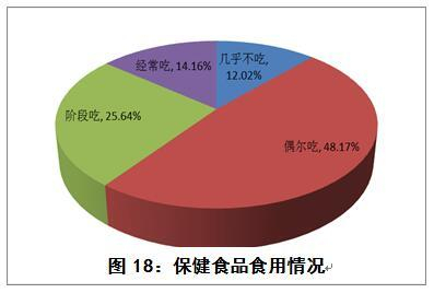 调查结果显示,7195名消费者购买保健食品时,超过半数的受访者在每月支出上不超过300元,约20%受访者每月不超过500元,约10%的受访者每月支出不超过1000元,累计来看,超过80%消费者关于保健食品的每月支出项不超过1000元。价格昂贵的所谓“高端产品”的保健食品其消费人群所占比例较低,整体消费支出意识相对谨慎(图17)。绝大多数受访者都有食用保健食品的经历,48.17%受访者“偶尔吃”,25.64%的受访者“阶段吃”,14.16%的受访者会“经常吃”。只有12.02%的受访者反馈“几乎不吃”(图18)。