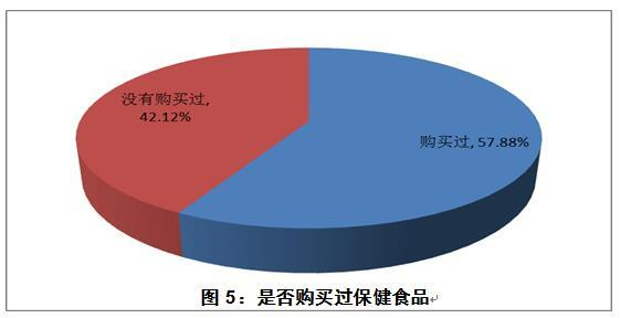 本次问卷调查为随机抽样调查,以在线调查为主、少数采取线下实地拦截访问相结合的方式,有效问卷总数为12,430份。本次被调查人群总体男性居多,占总人数的62.57%(图1);年龄层次以青年人群为主,18岁-35岁占52.59%,超过55岁以上的老人仅占5.83%(图2);文化程度上高中以下学历占25.04%,专科及以上学历占74.96%(图3);被调查人群总体身体健康状况良好,相当健康和基本健康人数达到85.25%,不太健康只占14.75%(图4);有购买保健食品经历的消费者7,195名,达到受访人群的57.88%(图5)。