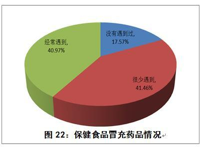 根据调查结果,消费者对于当前我国市场上所谓“保健食品”(含保健食品、非法宣称功效的普通食品、非法生产经营的假冒保健食品等)广告宣传信任度较低,占比超过六成(图21)。同时,消费者遇到“保健食品”冒充药品现象也不在少数,约40.97%的消费者表示“经常遇到”(图22)。