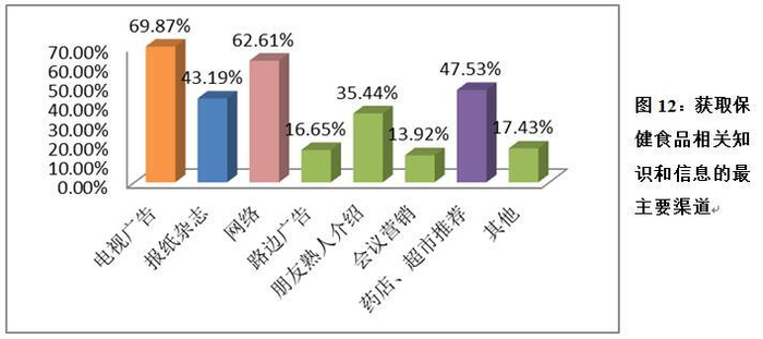 调查结果显示,消费者对保健食品信息的获取渠道最主要源于“电视广告”和“网络”,所占比例分别达到69.87%和62.61%。同时,超过四成消费者从“报纸杂志”和“药店、超市推荐”获悉保健食品信息,约三成消费者还会由朋友熟人介绍而获取相关信息,部分消费者会根据“路边广告”或参加“会议营销”获知保健食品的信息(图12)。