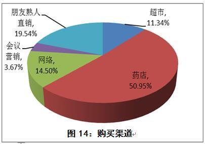 “蓝帽子”标志,是经国家主管部门审批的保健食品特有标志。调查结果表明,在7195名购买过保健食品消费者中,选购保健食品时,超过五成消费者会同时查看“蓝帽子”标志和产品的批准文号,另有两成多消费者只查看产品的批准文号,还有一成多消费者会因为“别人推荐”而购买(图13)。调查结果还显示,消费者购买保健食品首选药店,占50.95%;其次,“朋友熟人直销”占19.54%;另有14.5%的消费者通过网络购买(图14)。