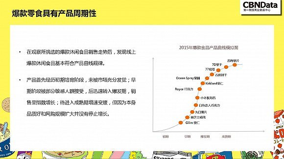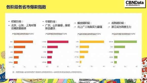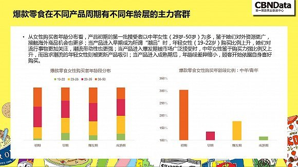 根据对爆款单品生命周期的分析,网红产品一般经历初期培育期、早期引进期、爆发增长期和成熟期四个阶段。通过对处在不同阶段的流行单品的分析,该报告认为,一二线城市的中年女性是爆款零食的主要推手。