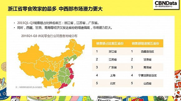 2015年前三个季度的数据显示,来自浙江、江苏、广东的消费者是零食在线购买的大户。中西部地区和三四线城市仍有很大的增长空间。