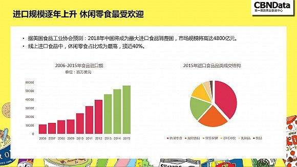 按美国食品工业协会预测,到2018年,中国将吃掉4800亿元的进口食品,位居全球第一。线上进口食品销售一片畅旺,零食更是其中的“大功臣”。报告指出,目前进口休闲零食销售额占到了线上进口食品的40%,?2012年-2015?年平均增长率超过80%,远高于其它品类。