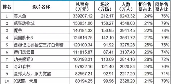 具体影片来看,大年初一上映的《美人鱼》仍然以33.9亿元的票房纪录,位居冠军宝座。实际上,除《美人鱼》外,春节档期间其他两部大片《西游记之孙悟空三打白骨精》、《澳门风云3》均在票房前十之列。除了上述三部国产电影外,另外一部跻身2016上半年票房TOP10的国产片是涉嫌“刷票房”的《叶问3》。