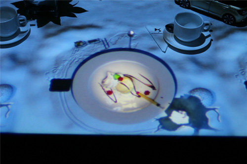 以往,对于餐桌艺术,我们的印象总停留在米其林餐厅对于每道菜精美的摆盘、无可挑剔的食材搭配和细致的服务,而乌戈·米兰朵却用高科技手段,让餐桌变得不再单调。当就餐者入座后,位于餐桌顶部的高清投影设备造就了餐桌上精致的画面。精心打造的故事“小厨师奇遇记”,用可爱的小厨师形象,向人们用卡通的形式展现了一道菜如何被它用自己的方式“制造“出来的过程。乘坐雪橇而来的”小厨师“,在地上堆雪球,雪球被抛向盘中成为了冰淇淋球;搞笑的巧克力酱的淋撒过程;最后烟花倒塌融化了地面冰雪,”小厨师“差点遇险……整个故事环节中,不少搞笑的画面,让小编捧腹大笑。
