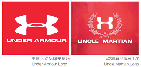 UA在给《中国经济周刊》发来的声明中表示,他们认为廷飞龙体育品牌马丁叔Uncle Martian 抄袭了自己的红白色 Logo,前者的 Logo 是方向相反尾部交叉的两个“U”,后者也是两个方向相反的“U”。