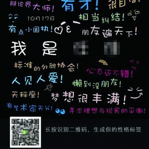从上周开始,这个小游戏就开始在朋友圈中走红。图片的中间是发布者的姓名,周边则环绕着几个甚至十几个用来描述其性格、行为的词汇以及简笔画表情。在图片的左下角,有一个二维码标签,旁边还有一行小字,“长按识别二维码,生成你的个性标签。”