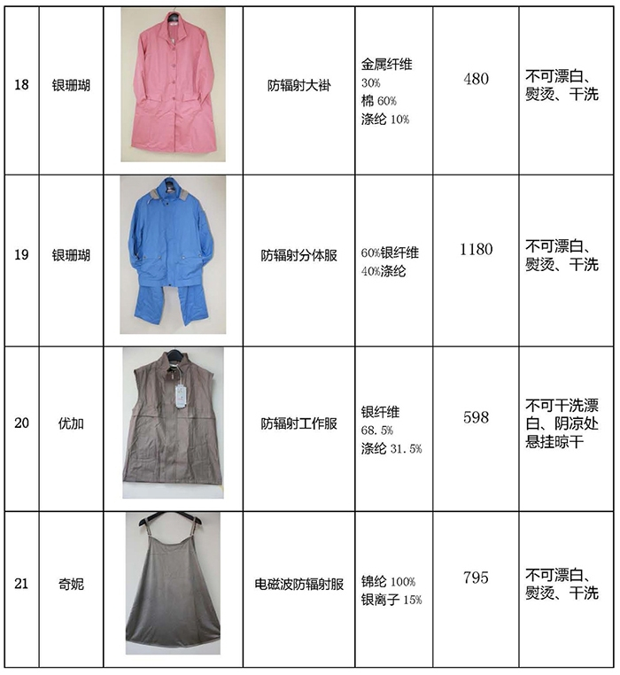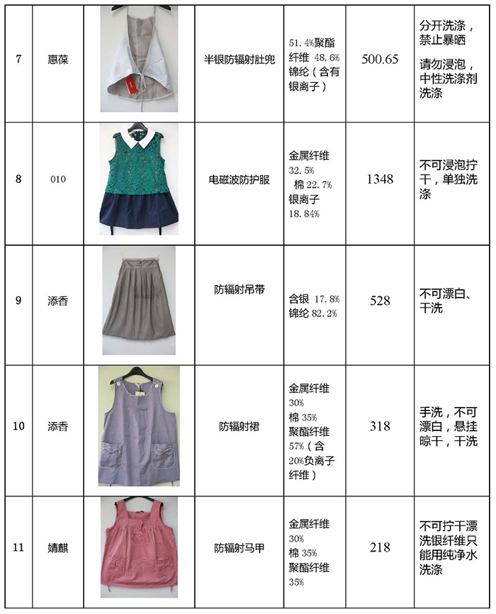 1.比较试验样品是消协工作人员以普通消费者身份,在北京市实体店(大型商场)和互联网销售渠道随机购买。所购样品主要涉及市场上主流的两大类型材质,即银纤维防辐射服和金属纤维防辐射服。