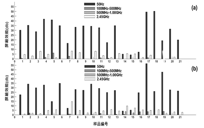 图3:未洗样品对不同频率电磁波屏蔽效能。(a) 胸部 (b) 腹部