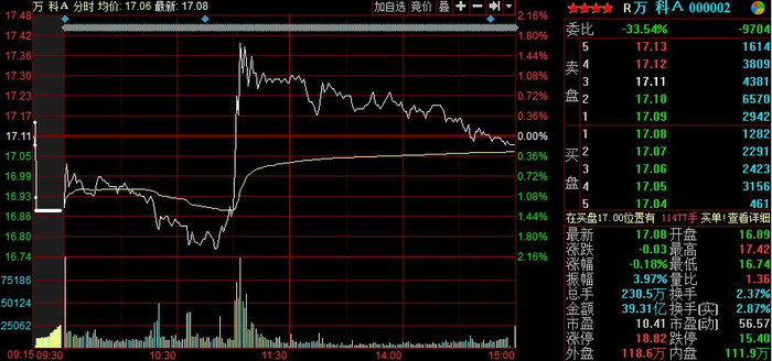 受该消息影响,万科A昨日低开,然而,临近午盘股价突然拉升,从下跌逾2%一度拉升至上涨近2%,午后有所回落,最终小幅收跌。截至收盘,万科A收报于17.08元,下跌0.18%,成交金额近40亿元。