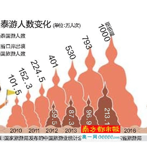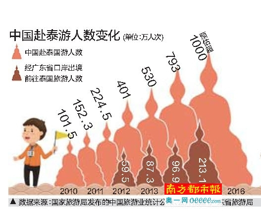 近年来,赴泰旅游人数连年攀升。2015年,中国赴泰游人数达800万左右,其中广东居民200多万人次,占1/4。而20 14年中国游客赴泰旅游的人数仅有400万人。泰国政府部门预估今年中国赴泰游客将突破1000万人。