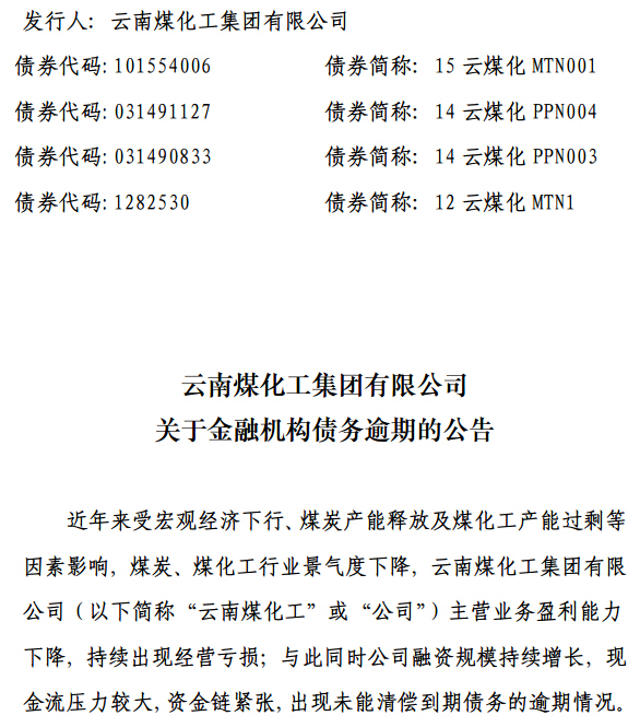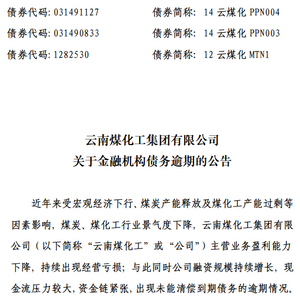 云南煤化工称,近年来受宏观经济下行、煤炭产能释放及煤化工产能过剩等因素影响,煤炭、煤化工行业景气度下降,云南煤化工集团有限公司(以下简称“云南煤化工”或“公司”)主营业务盈利能力下降,持续出现经营亏损;与此同时公司融资规模持续增长,现金流压力较大,资金链紧张,出现未能清偿到期债务的逾期情况。