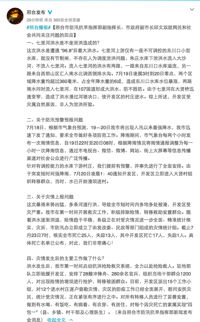 今天中午,河北省邢台市委对外宣传办公室官方微博发布了邢台市防汛抗旱指挥部副指挥长、市政府副市长邱文双就网民和社会共同关注问题的回应。