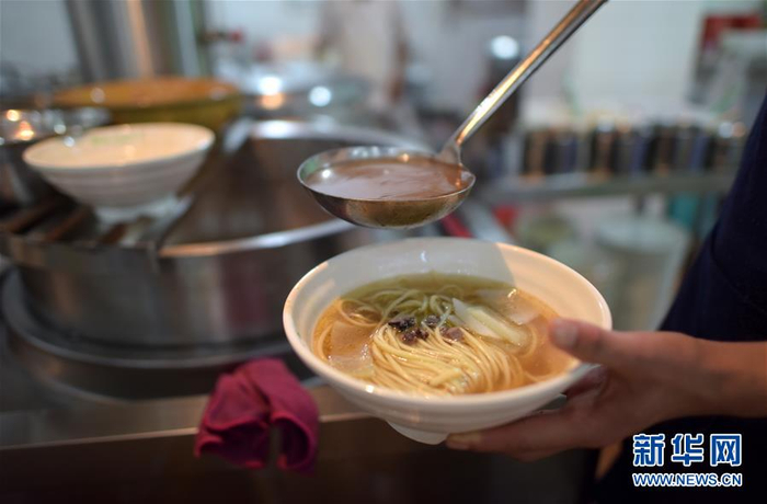 6月3日,面匠马斌在青海西宁的一家面馆里盛汤。新华社记者 张宏祥摄